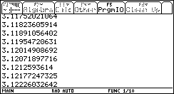 Package Contains 2 files each for the TI-73, TI-82, TI-83, TI-83+, TI-85, TI-86, TI-89, TI-92, and TI-92+. A single text files covers the TI-80 and TI-81. Of course the TI-92+ files double for the V200. The 1st file (TI-73-TI-86) prompts for N (on the 89-V200 type 'wallis(N)') and starts converging. When you either press a key or it finishes it exits, clears the screen, and erases all variables used. The 2nd file for each on prompts for N, converges, and exits only when finished (unless you press ON). It doesn't clean up after itself. The 2nd file's only made for those w/ very little memory. Hope you enjoy. Product((2x)^2/((2x-1)(2x+1))), x=1 to infinity