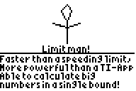 Amazing program, at a meager 991 bytes, it is probably the best program for calculating limits I have ever seen. It solves the limits instantly and is 100% correct based upon 200 problems I have done. LimitMan is simple to user friendly and takes about 2 seconds to learn how to use it. Thanks for the great program!