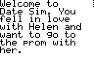 You, like the author of this game, are a nerd. Unfortunately, you've fallen in love with Helen and decide to take her to the prom. However, it seems like a long shot, something that would never happen. But hey, we all have rotten love lifes right? So try to make your artificial love life the best it can be, in my latest text-RPG, DateSim v.1.0. It's not just any ordinary BASIC program. I consider this to be one of my best BASIC works. Give it a try, give romance a try, and give DateSim v.1.0 a try, one of the better-written BASIC games.