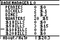 Bank Manager is a new program that allows you to keep track of money in, say, a wallet or a 'piggy' bank via a custom list. It tells you information by dollars and cents. The amount of coin/bills is shown, along with the amount of money it adds up to, and a grand total. Easy to use GUI to edit money; small and compact.