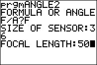 ANGLE2: Do you have a camera and want to know its angle of view? Or do you just want to know what a specific angle looks like. Then this is a program for you. First you choose whether to enter values for the formula: 2*arctan(sensor size /(2*focal length))= angle of view, or if you want to enter the angle right away. By sensor size is ment the horizontal size of the sensor in mm, if you want to know the horizontal angle. If you want to know the diagonal angle you enter square root of the horizontal side to the power of two, plus the diagonal side to the power of two. ( sqr( s1^2 + s2^2) Pythagoras formula ). Then you enter the focal length in mm. The program then draws a circle sector with that angle. ANGLE3: This program can take several sets of values. It uses a list to host them. After youâÂÂve entered them the program draws up the data one by one on the screen. OPTICS: This program lets you choose an unknown from focal length: F, size of sensor: S, or angle: A. There are three formulas in it, one for each constant.