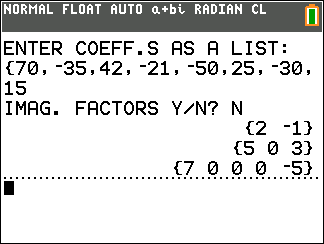 This program can factor polynomials with complex coefficients, as well as imaginary and real ones. But only integer coefficients with rational coefficients in the factors. You enter the polynomials coefficients as a list, i.e. it is the size of the list that decides the degree of the polynomial, so there must be a number for each position in the polynomial. For example: 64x^6-729, is entered as, {64,0,0,0,0,0,-729}. The program is based on AFACTOR5. There is a choice wether to search for real factors or imaginary and complex ones. A subroutine, ADIVCMPX, needs to be installed. News in this version is that you can enter multiple equations at once, if you wish. You separate them with pi.